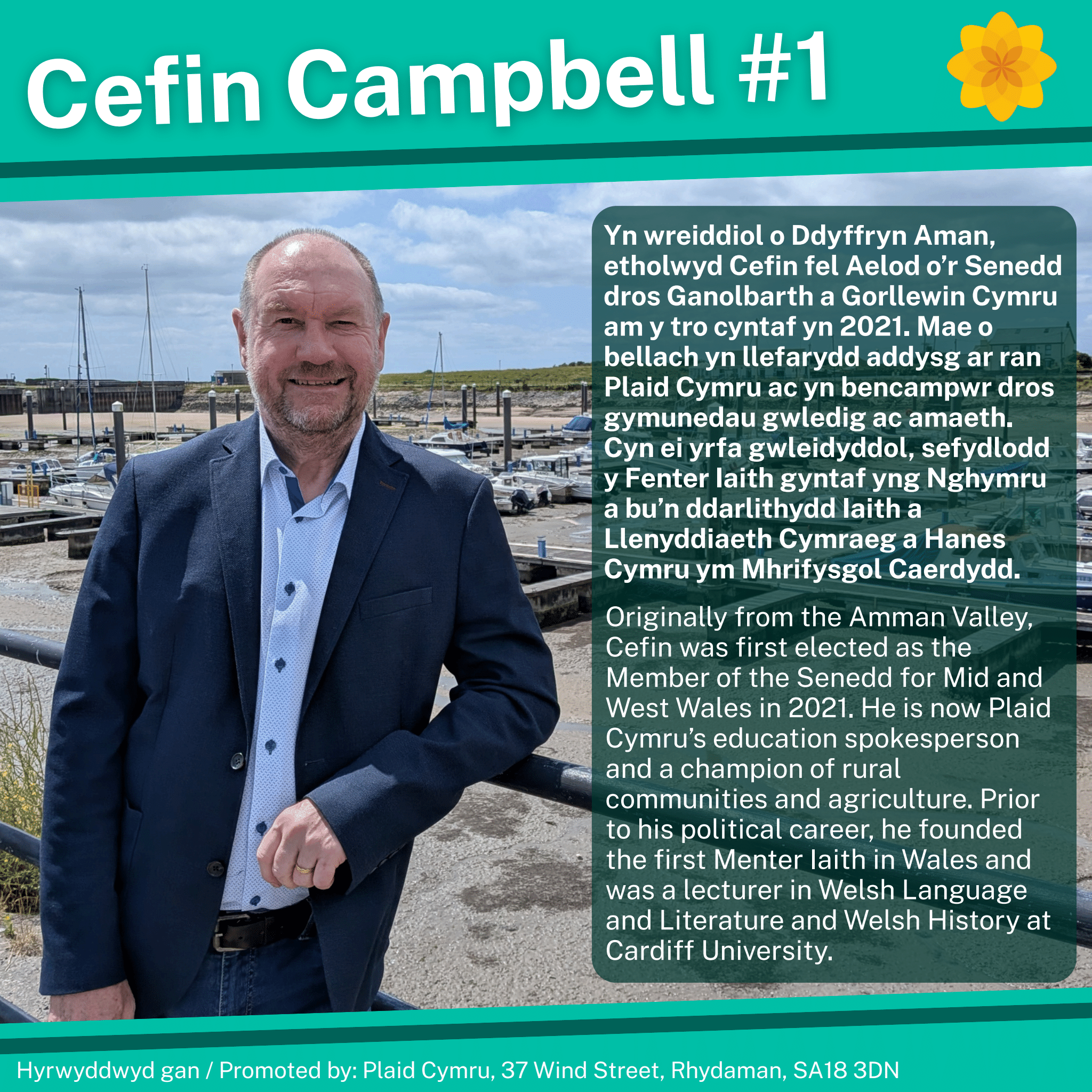 Cefin Campbell: Yn wreiddiol o Ddyffryn Aman, etholwyd Cefin fel Aelod o’r Senedd dros Ganolbarth a Gorllewin Cymru am y tro cyntaf yn 2021. Mae o bellach yn llefarydd addysg ar ran Plaid Cymru ac yn bencampwr dros gymunedau gwledig ac amaeth. Cyn ei yrfa gwleidyddol, sefydlodd y Fenter Iaith gyntaf yng Nghymru a bu’n ddarlithydd Iaith a Llenyddiaeth Cymraeg a Hanes Cymru ym Mhrifysgol Caerdydd.
