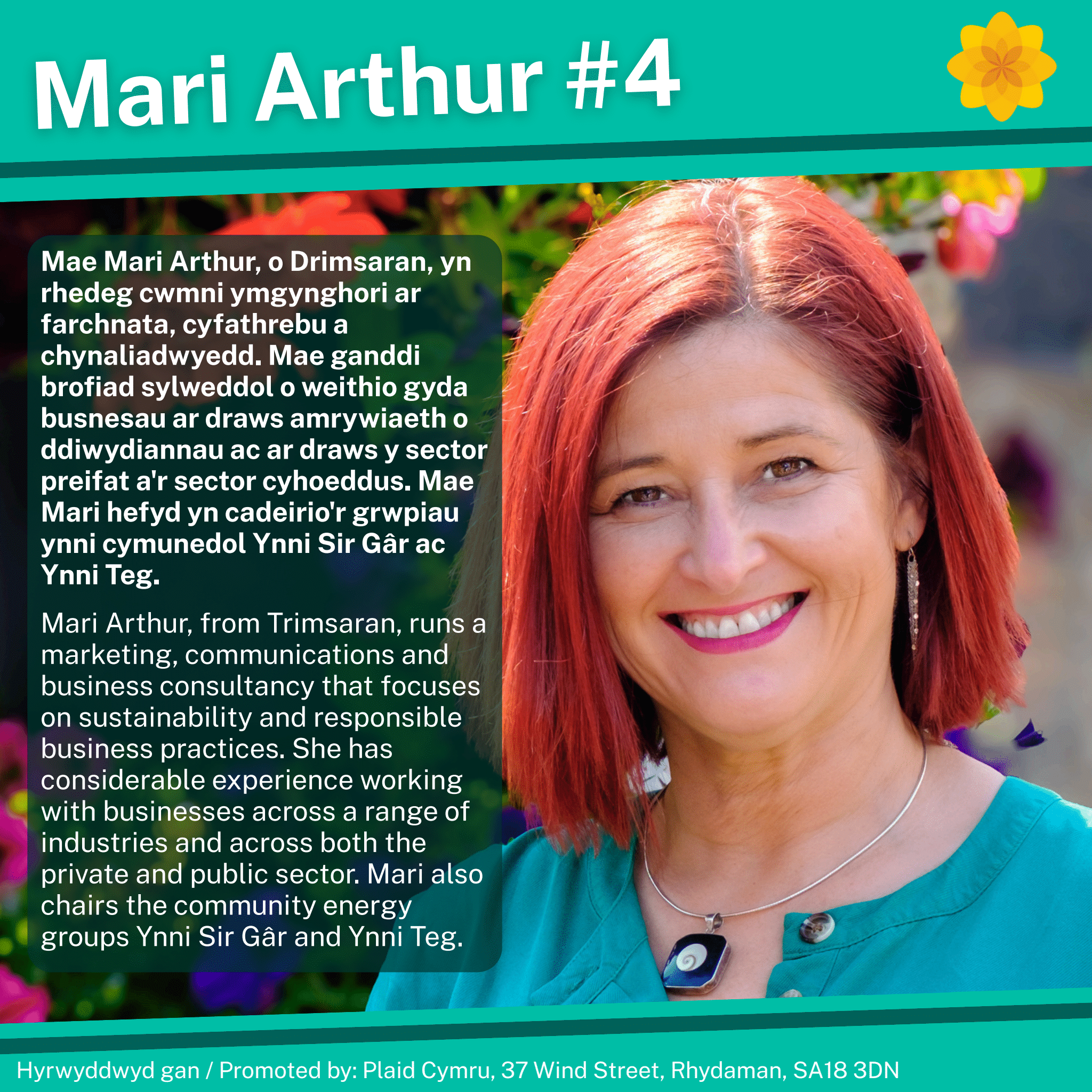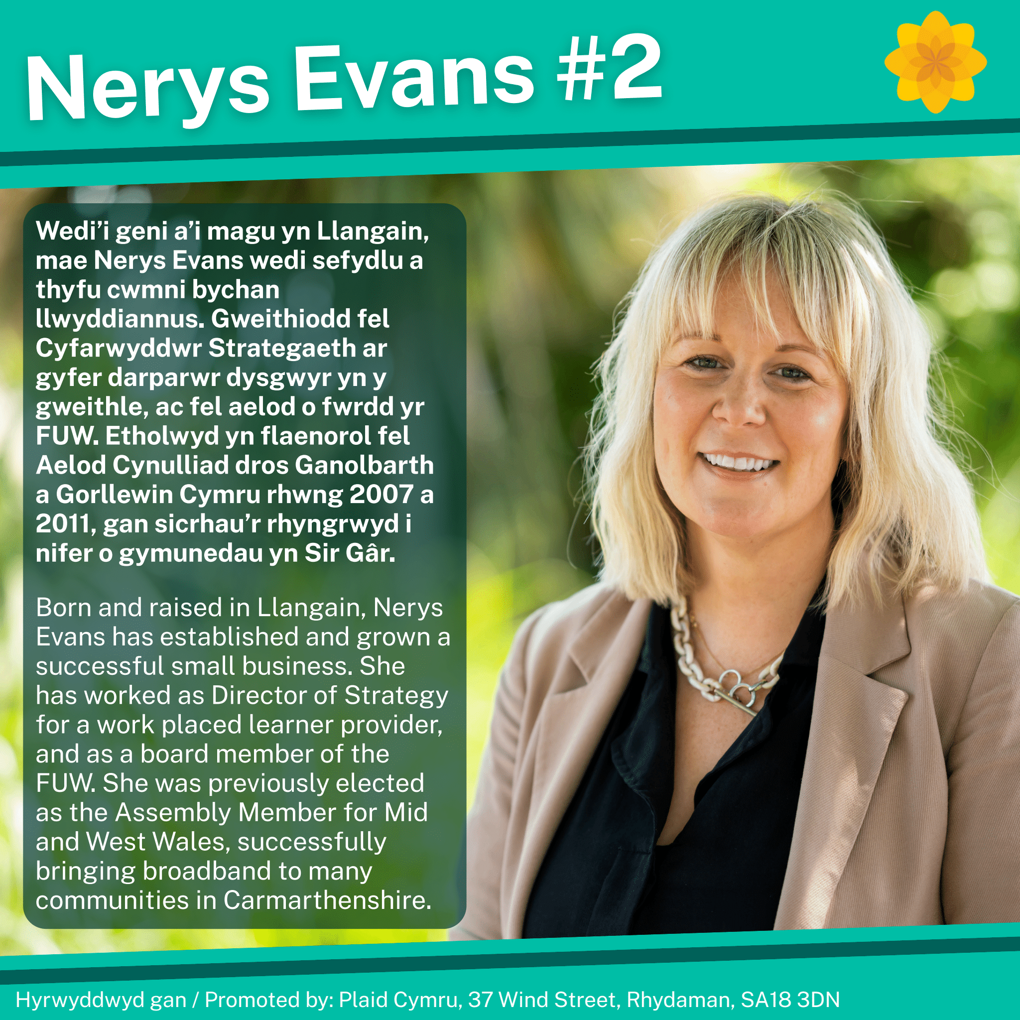 Nerys Evans: Wedi’i geni a’i magu yn Llangain, mae Nerys Evans wedi sefydlu a thyfu cwmni bychan llwyddiannus. Gweithiodd fel Cyfarwyddwr Strategaeth ar gyfer darparwr dysgwyr yn y gweithle, ac fel aelod o fwrdd yr FUW. Etholwyd yn flaenorol fel Aelod Cynulliad dros Ganolbarth a Gorllewin Cymru rhwng 2007 a 2011, gan sicrhau’r rhyngrwyd i nifer o gymunedau yn Sir Gâr.