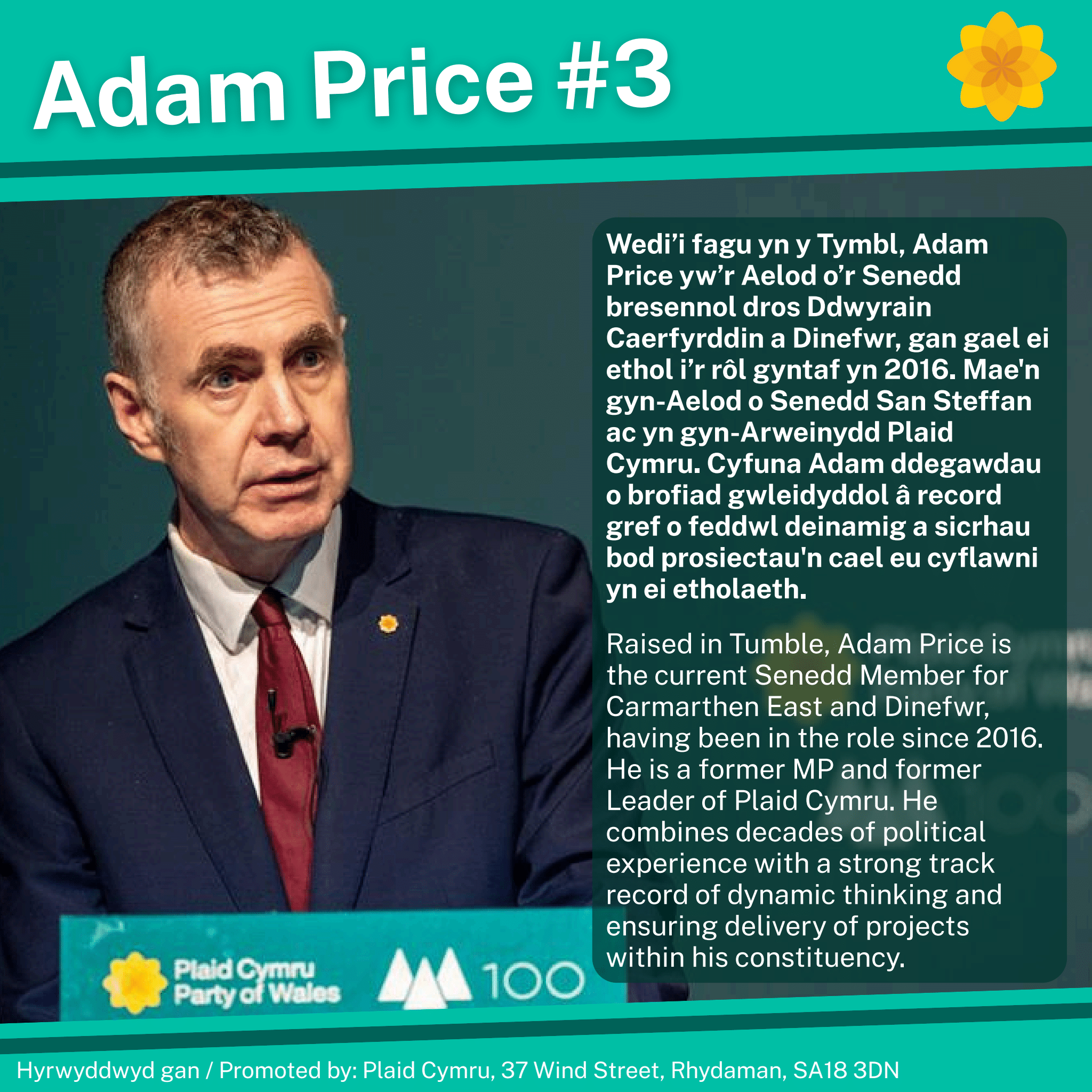 Adam Price: Wedi’i fagu yn y Tymbl, Adam Price yw’r Aelod o’r Senedd bresennol dros Ddwyrain Caerfyrddin a Dinefwr, gan gael ei ethol i’r rôl gyntaf yn 2016. Mae'n gyn-Aelod o Senedd San Steffan ac yn gyn-Arweinydd Plaid Cymru. Cyfuna Adam ddegawdau o brofiad gwleidyddol â record gref o feddwl deinamig a sicrhau bod prosiectau'n cael eu cyflawni yn ei etholaeth.